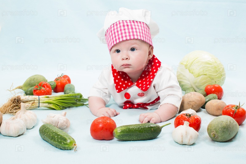Девочка в колпаке шеф-повара с овощами. Концепция здорового питания