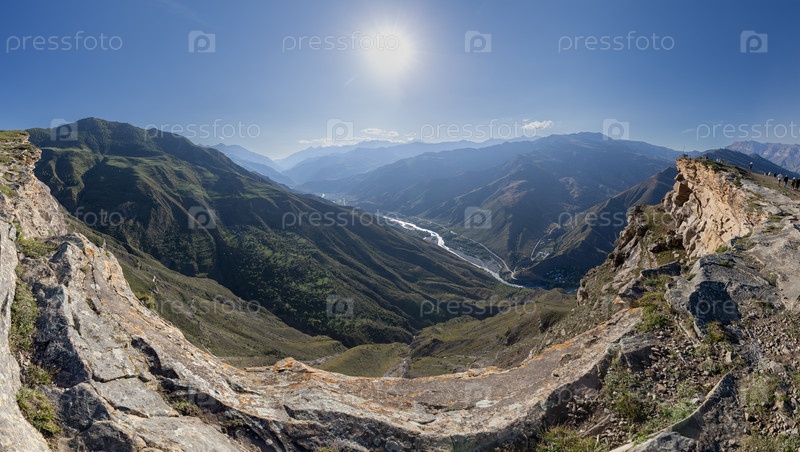 Панорамный вид пейзажа в горах Дагестана, Северного Кавказа, Россия. Река протекает через долину. Вид на крутые склоны и горные хребты, скрытые легким туманом в солнечный день