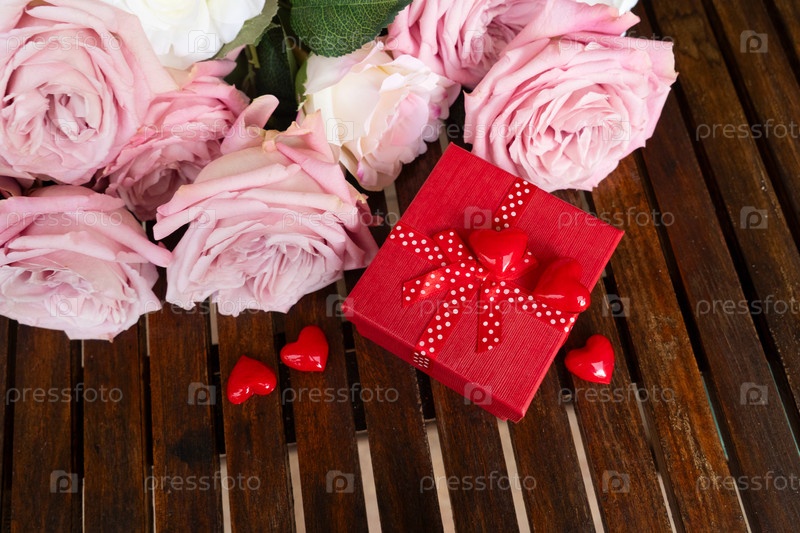Цветочный букет розовых роз с коробкой для подарков, фон Дня святого Валентина