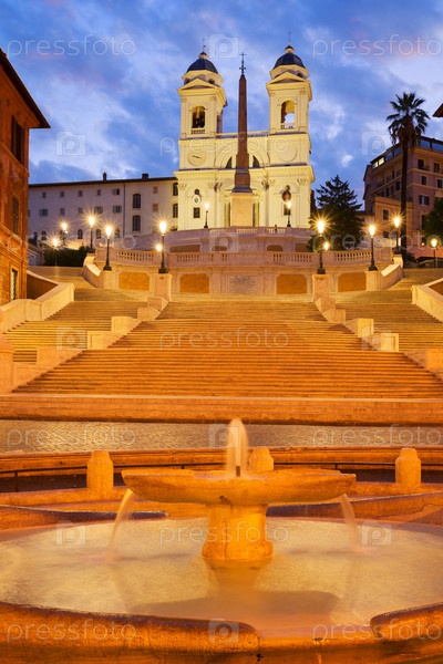 Испанская лестница с фонтаном, освещаемым ночью, Рим, Италия