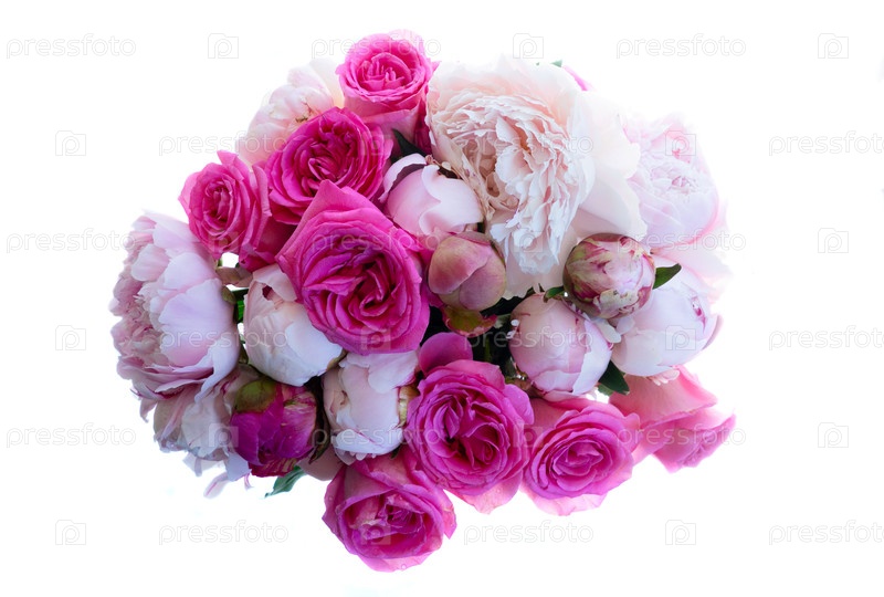 Свежие пионы и букет роз подчеркнуты на белом фоне