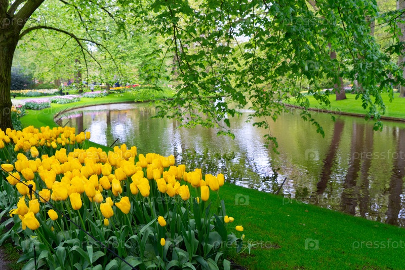 Извилистый путь с тюльпанами, цветочные клумбы и текущая река - весенний формальный сад