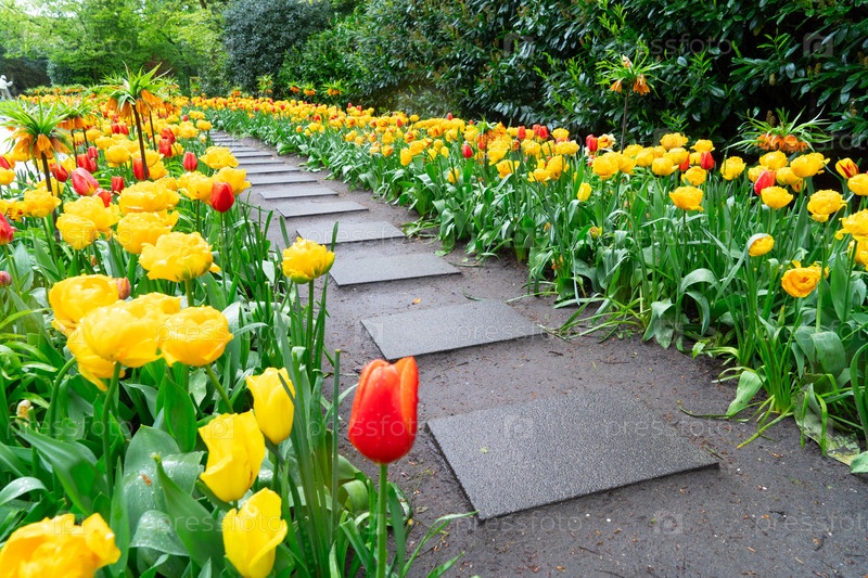 Извилистый путь с тюльпанами, цветущий сад весеннего формального сада