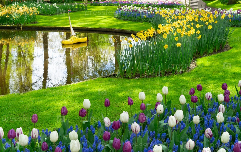 Красочные цветущие и цветящиеся тюльпаны возле пруда, цветочный весенний формальный сад