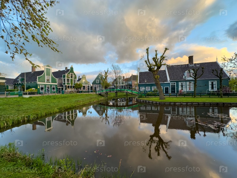 Традиционные голландские дома Zaanse Schans над водой на летнем закате, Нидерланды