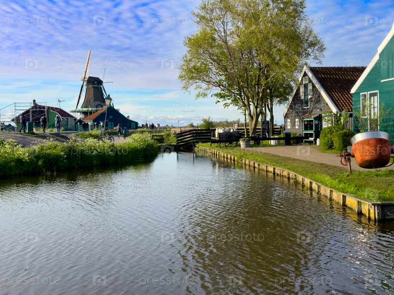 Традиционные голландские ветряные мельницы и дома Заансе Шана над водой при закате солнца летом, Нидерланды
