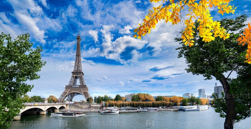 Знаменитые достопримечательности Парижа Эйфелева башня с зеленым деревом над рекой, Париж Франция, панорама веб-баннера