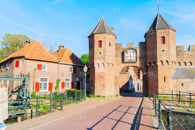 Средневековые ворота Линкпорт-гейт над водой канала, Амерсфорт, Нидерланды