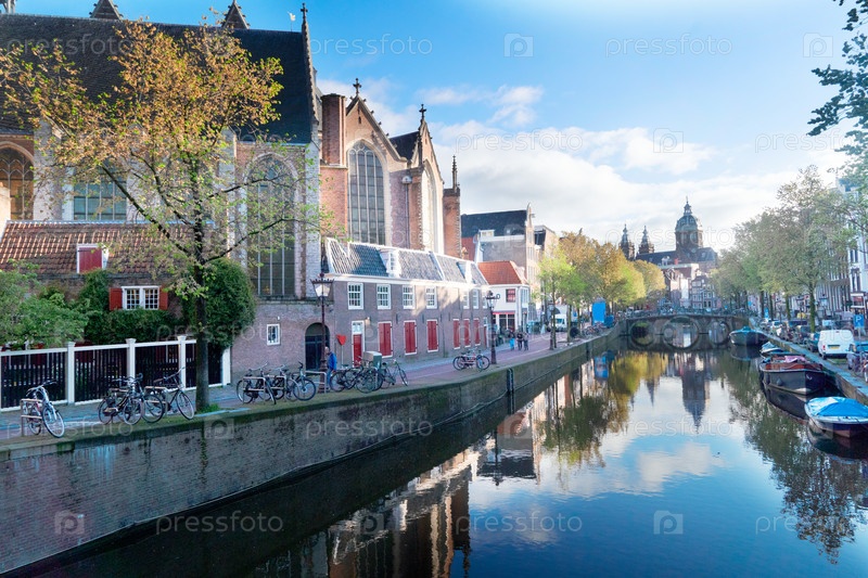 Фасады старых исторических домов, мостов и деревьев над водой канала, Амстердам, Нидерланды