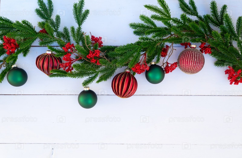 Красивое праздничное украшение с вечнозелеными ветвями, ягодами и сосновыми шишками на деревянном фоне