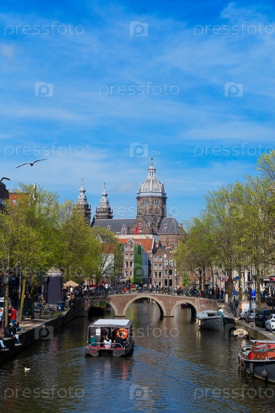 Фасады старых исторических домов и церковный канал Святого Николая, Амстердам, Нидерланды