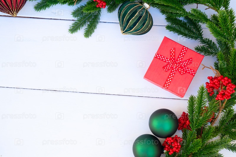 Красивое праздничное украшение с вечнозелеными ветвями, ягодами и сосновыми шишками на деревянном фоне