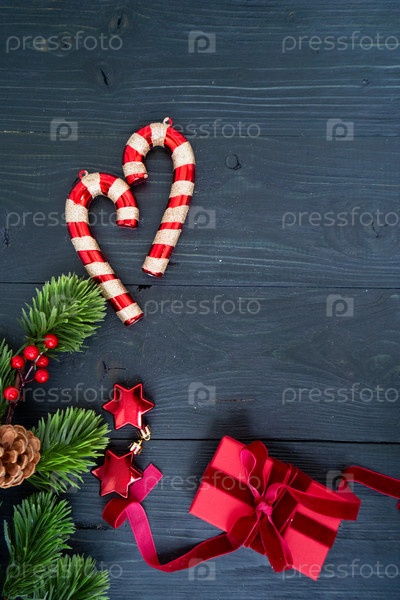 Красочные рождественские украшения с конфетами, блестящие декорации и подарок красиво упакованный в красную ленту