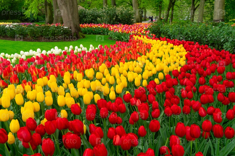 Поле тюльпанов с рядами в солнечный день с голубым небом