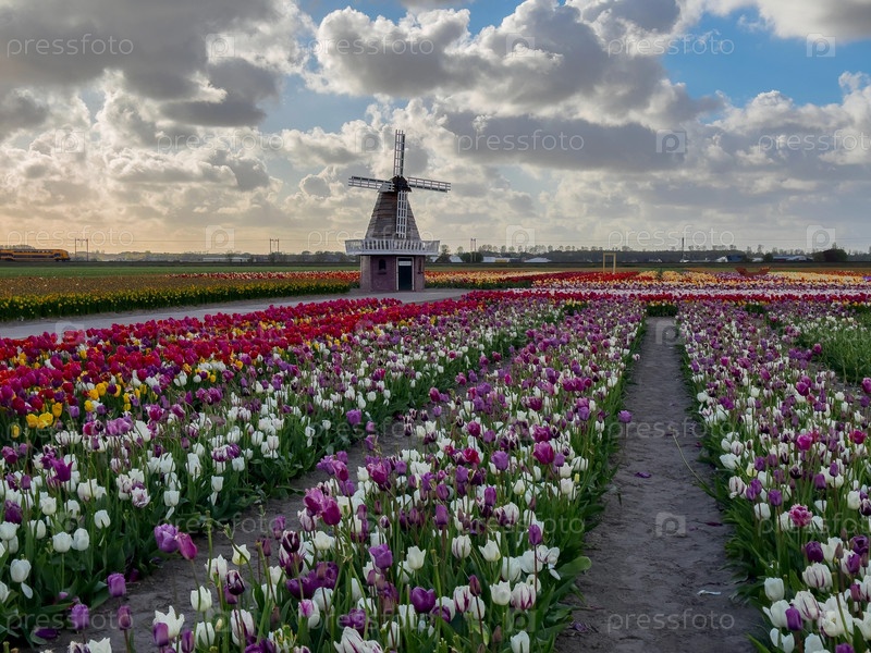 Голландская ветряная мельница над полем цветов тюльпанов в солнечный день, Нидерланды