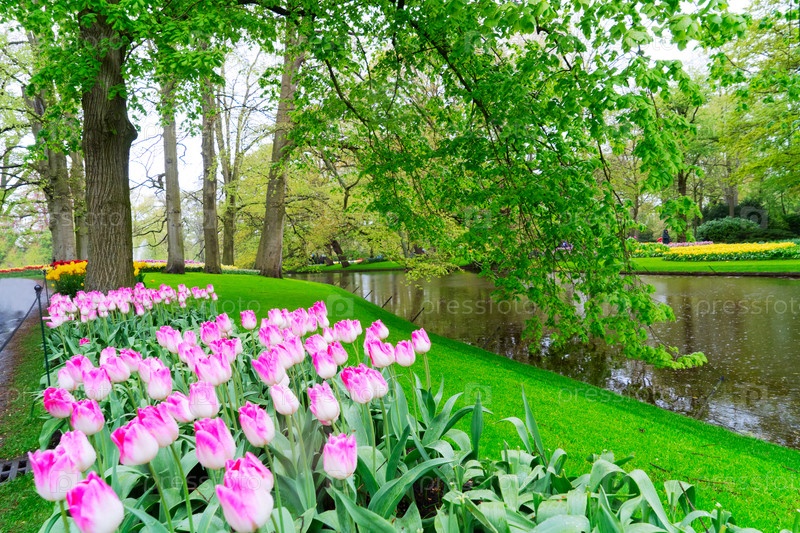 Красочные растущие тюльпаны и цветущее дерево весной в формальном саду