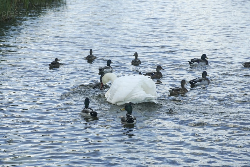 Белый лебедь, окруженный утками на озере