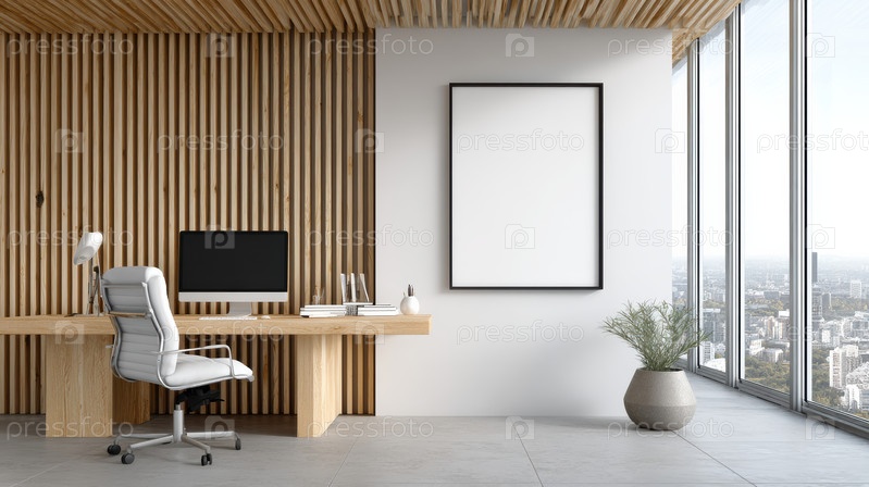 Современный минимализм Домашний офис, который имеет потрясающий пейзаж и эффективно использует мягкую нейтральную палитру