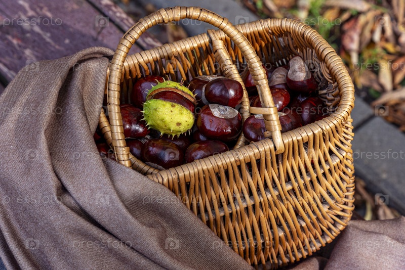 Корзина из плесеня в рустическом стиле, наполненная свежими каштанами и зелеными оболочками