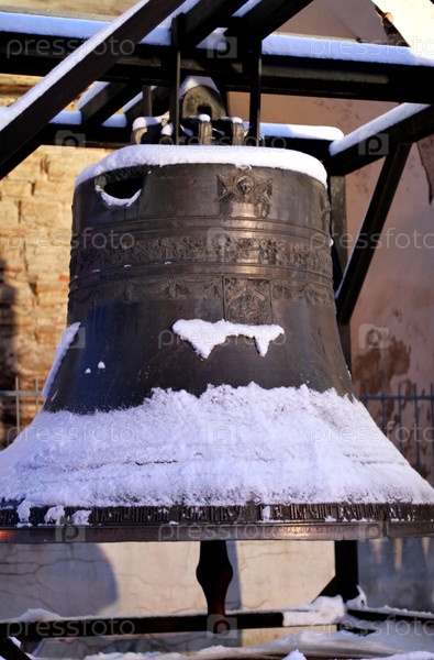 Древний колокол Софии Белл в снегу в Новгородском Кремле в Великом Новгороде. января 2026
