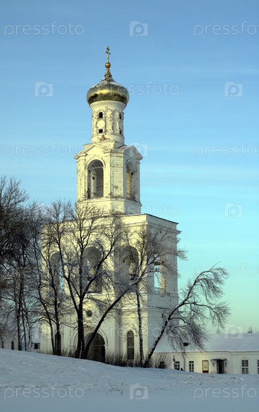 Колокольня ворот Юрьевского монастыря в Великом Новгороде, зимний пейзаж. январь 2026