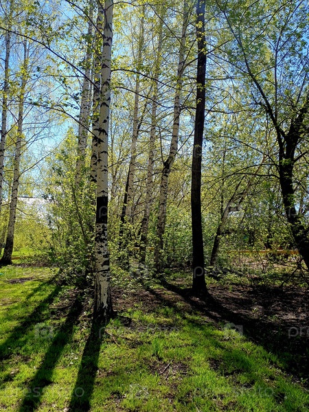 Солнечный свет фильтруется сквозь высокие деревья в тихом лесу во время яркого весеннего дня