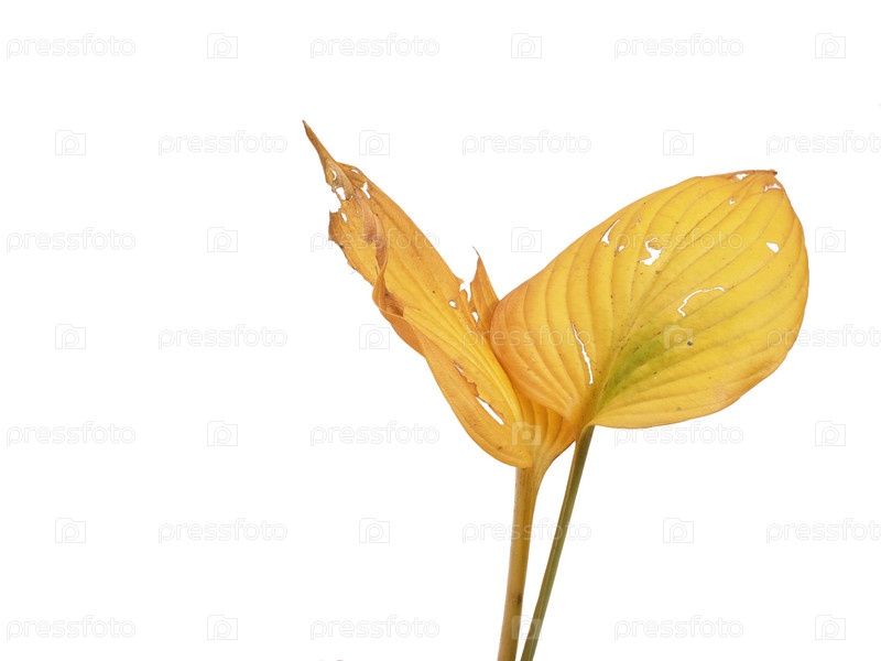 Закройте два перекрывающихся желтоватых листа Hosta, изолированных на белом фоне и вырез готов