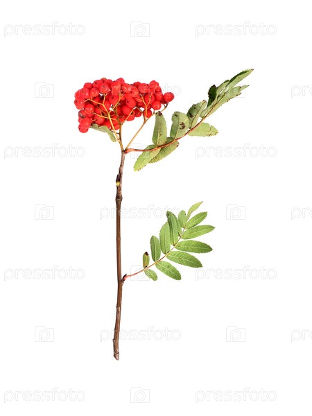 Ветвь с ярко-красными ягодами пепла и зелеными листьями изолирована на белом фоне, вырезка готова