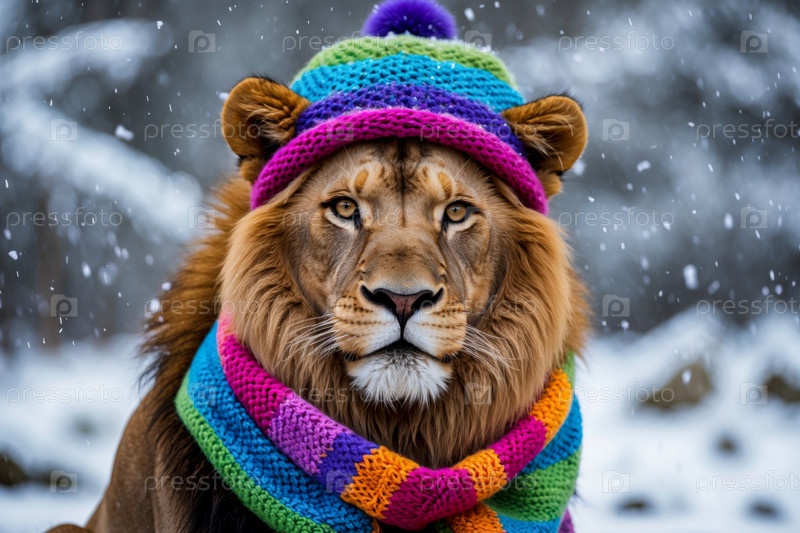 Портрет льва в вязанной зимней шляпе и шарфе, животное с снегом зимой