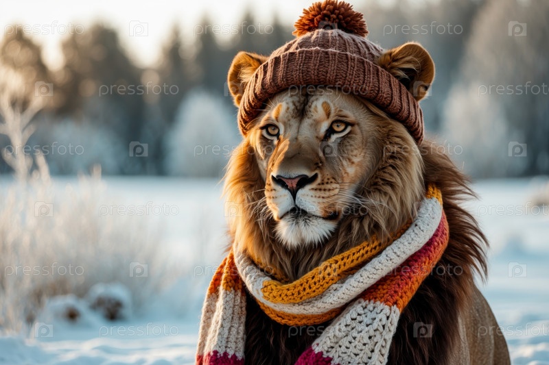 Портрет льва в вязанной зимней шляпе и шарфе, животное с снегом зимой