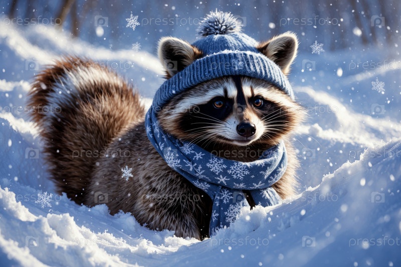 Портрет вязаной зимней шляпы и шарфа, животное в снегопаде зимой