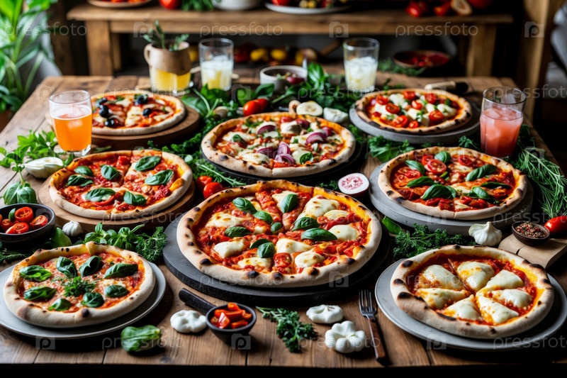 AI Generative Italian Pizza на декорированнод столе Background, Food Photo for Restaurant Menu Pizzeria
