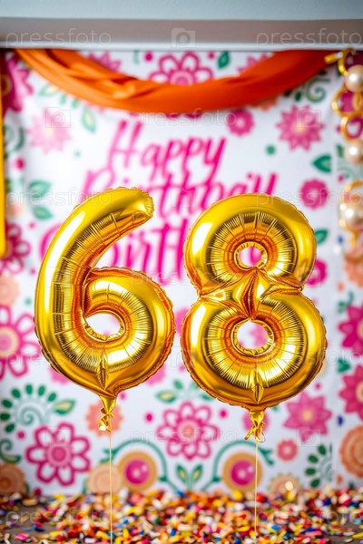 Гелиевый баллон на день рождения номер шестьдесят восемь, фигура золотых букв 68 праздничный фон