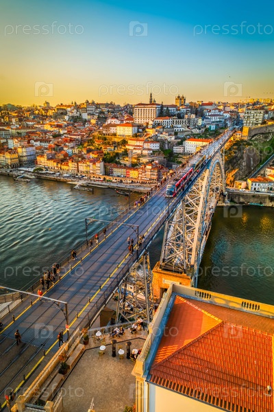 Живописный, красочный вид на старый город Порто со знаменитым мостом ночью, Португалия с Мостом Понте Дом Луиса через реку Дуро