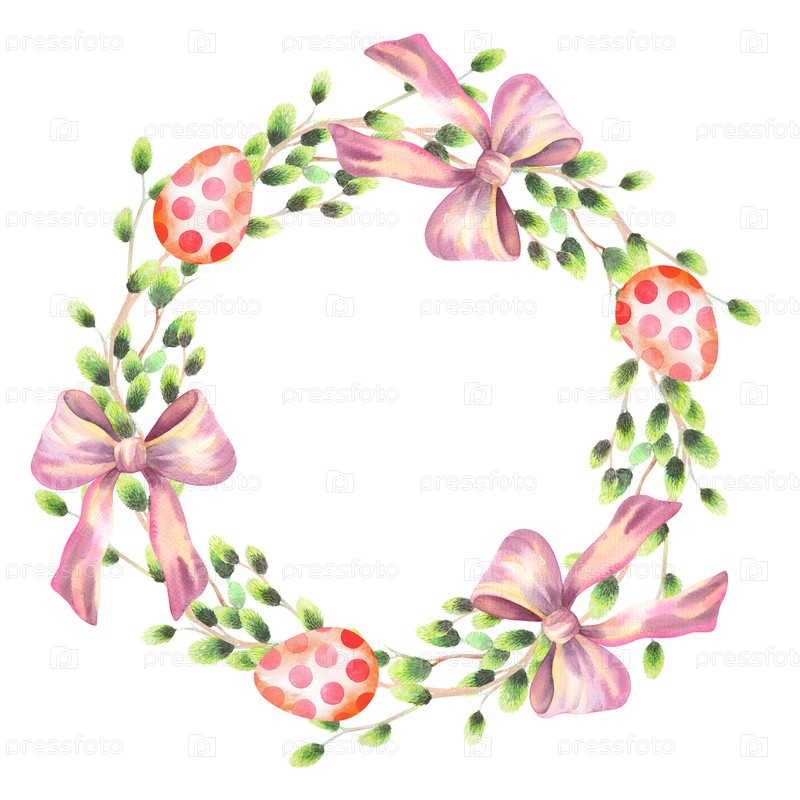 Венок из ветвей ивы, лука и пасхальных яиц. Иллюстрация акварели ручной работы. Для ткани, обоев, упаковочной бумаги, поздравительных открыток, дизайна, декора и иллюстрации
