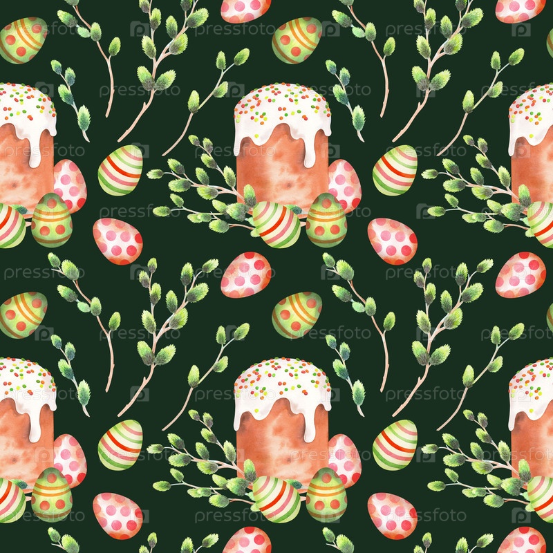 Бесшовный рисунок пасхального торта, игл и пасхальных яиц на зеленом фоне. Иллюстрация акварели. Для ткани, обоев, упаковочной бумаги, поздравительных открыток, дизайна, декора и иллюстрации