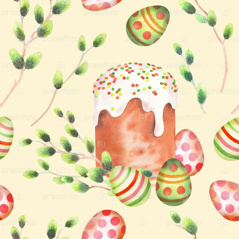 Бесшовный рисунок пасхального торта, игл и пасхальных яиц на бежевом фоне. Иллюстрация акварели. Для ткани, обоев, упаковочной бумаги, поздравительных открыток, дизайна, декора и иллюстрации