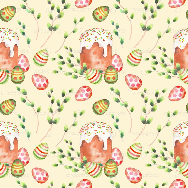 Бесшовный рисунок пасхального торта, игл и пасхальных яиц на бежевом фоне. Иллюстрация акварели. Для ткани, обоев, упаковочной бумаги, поздравительных открыток, дизайна, декора и иллюстрации