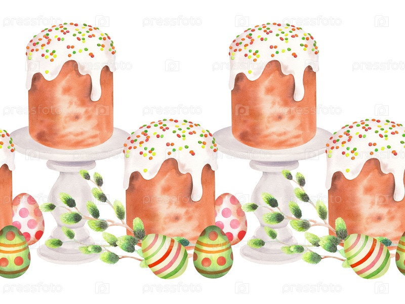 Бесшовная оболочка пасхального торта, пирога, игл и пасхальных яиц Изображение акварели. для ткани, обоев, упаковочной бумаги, поздравительных открыток, дизайна, декора и иллюстрации