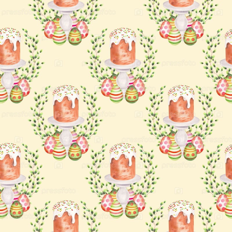 Бесшовный рисунок пасхального торта на стоячем торте, икры и яиц на бежевом фоне. Иллюстрация акварели. Для ткани, обоев, упаковочной бумаги, поздравительных открыток, ювелирных изделий