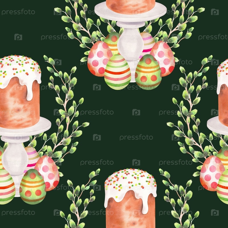 Бесшовный рисунок пасхального торта на стоячем торте, икры и яиц на зеленом фоне. Иллюстрация акварели. Для ткани, обоев, упаковочной бумаги, поздравительных открыток, украшений и иллюстраций