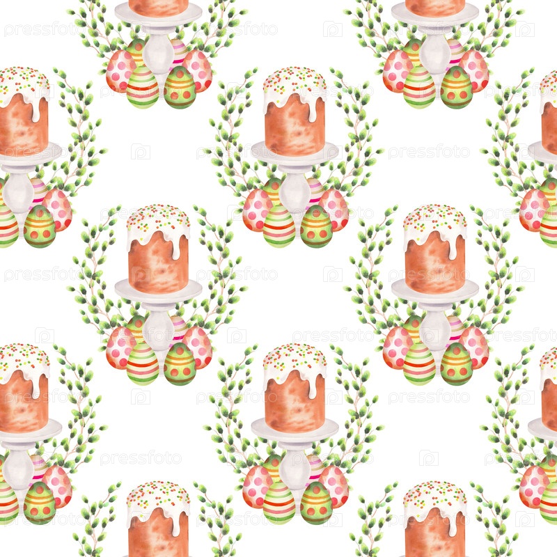 Бесшовный рисунок пасхального торта на стоячем торте, ивы и яйца. Илюстрация акварели. Для ткани, обоев, упаковочной бумаги, поздравительных открыток, украшений и иллюстраций