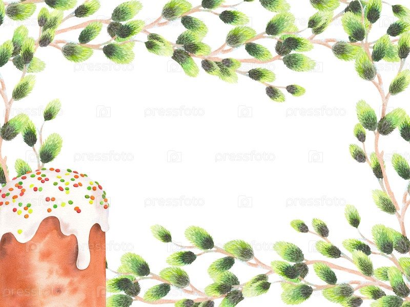 Восстановительная рама Ивовые ветви и пасхальный торт. Иллюстрация акварели. Для ткани, обоев, упаковочной бумаги, поздравительных открыток, украшений и иллюстраций