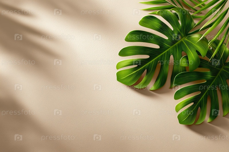 Чудовища и пальмовые листья на бежевом фоне с тенями