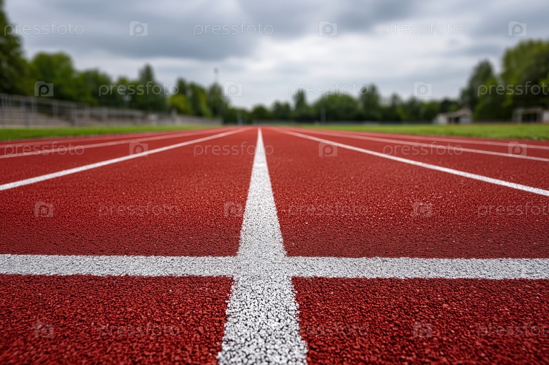 Красная беговая дорожка с белыми полосами под облачным небом, низкий угол