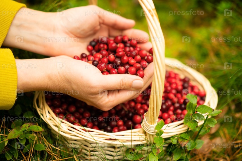 Закройте руку женщины, собирающей клюквы в лесной корзине. полная корзина ягод, урожай леса, органические фрукты, витамины, домашние консервы, осенняя природа, спокойный день на свежем воздухе