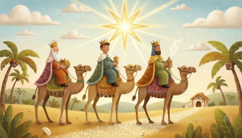 Иллюстрация Трех царей, следующих за Рождественской звездой через пустынный пейзаж, захватывающая темы руководства Проявления и духовного путешествия