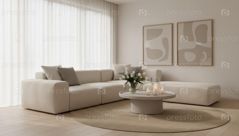 Минимальная тихая гостиная с мягким теплым белым тоном с нейтральной мебелью, нежным окружающим светом и деликатным декором, создавая спокойный интерьер.The 2026 Cloud Dance