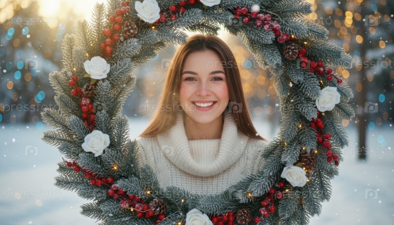 Зимний праздничный портрет с улыбающейся женщиной, обрамленной праздничным венком, символизирующим празднование радости и сезонных традиций