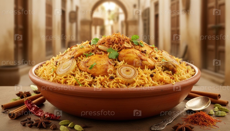 Традиционная миска Бирьяни, представляющая культуру южноазиатских специй в теплых уличных условиях во время праздничного сезона